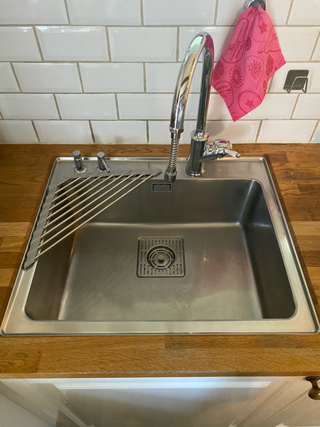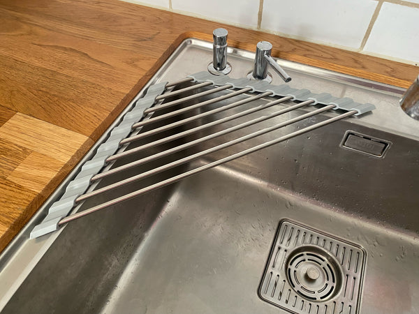 Praktisk sammenleggbart oppvaskstativ som rulles ut over vasken når det trengs og tar liten plass når det ikke brukes.Perfekt for bobil/campingvogn hvor plassen er begrenset.